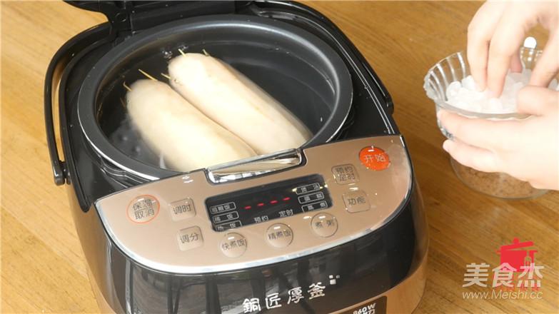 藕段放入電飯煲中,加入適量的水、冰糖、紅糖,選擇“粗糧飯”功能鍵