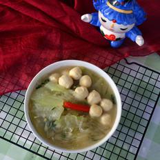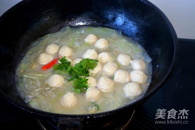 倒入雞肉丸子煮至開鍋,烹入雞精和香油。