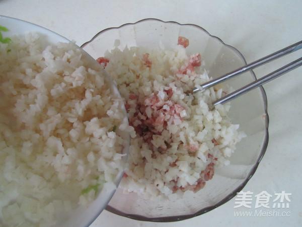 肉餡中加入點鹽、生姜粉、胡椒粉和料酒等調(diào)味料, 順著一個方向攪拌上勁;