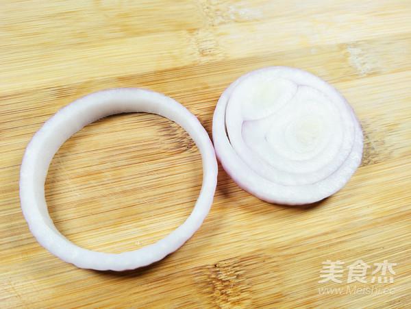 洋蔥洗凈,攔腰切片,取中間最大的那幾圈洋蔥。剩余洋蔥切丁備用。