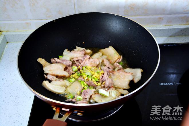 炒鍋熱油,炒香豬肉,再倒進蔥姜翻炒。