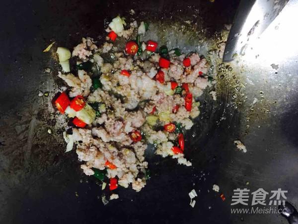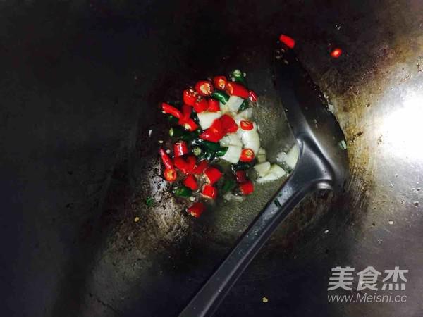 鍋內留少量的油,依次倒入蒜、辣椒,爆香