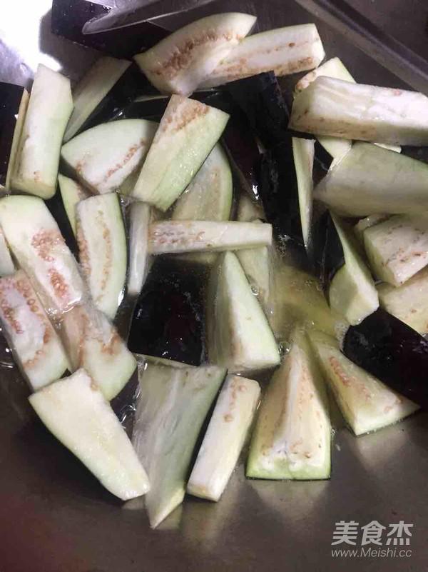 熱鍋內倒入適量的油,七分熱時,倒入瀝干水的茄子條,煎至茄子8放熟有點上色即可撈起