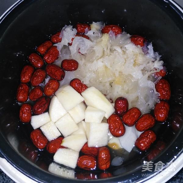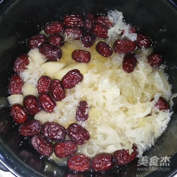 桃膠和皂角米需提前一天泡發(fā)至軟透,準(zhǔn)備煲湯的時(shí)候把雪耳用冷水泡幾分鐘變軟去掉硬蒂,撕碎,雪梨削皮切塊,山藥削皮切塊,紅棗清洗一下