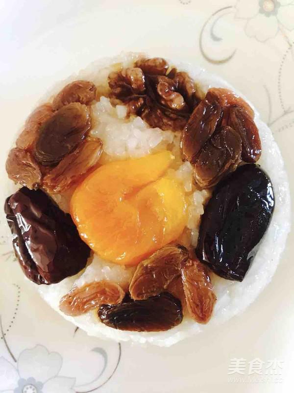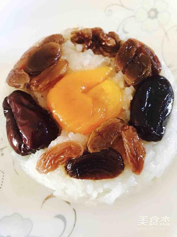 12.取出蒸好的八寶飯,倒入盤中,小心燙手。