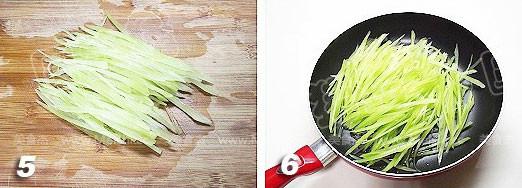 3.先斜切成大薄片,再切細絲;炒鍋里燒熱油,加入萵筍絲、鹽、雞精,用大火快速翻炒;直至萵筍絲變軟即可盛盤,最后用紅尖椒裝飾一下