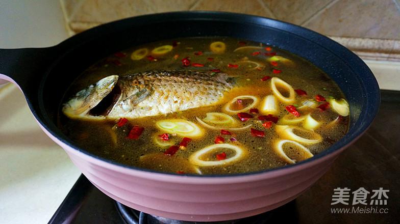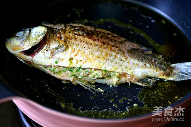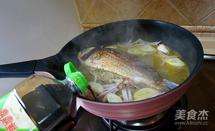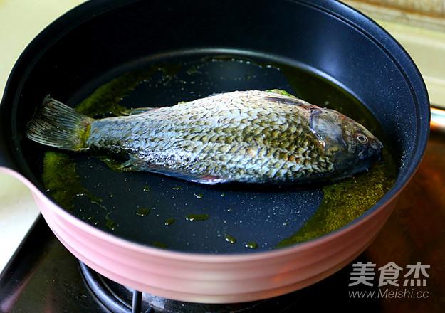 垂直放入鯽魚,小火慢煎,中間時不時晃動一下