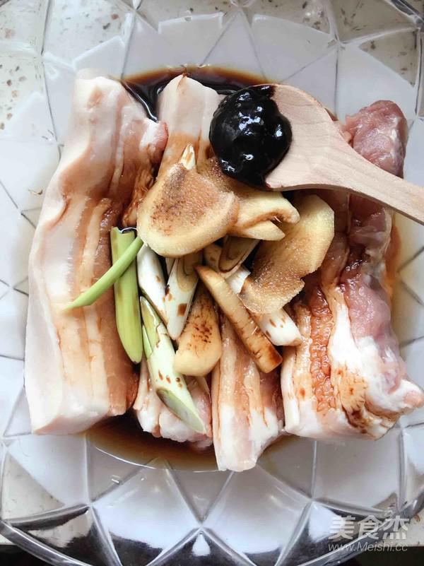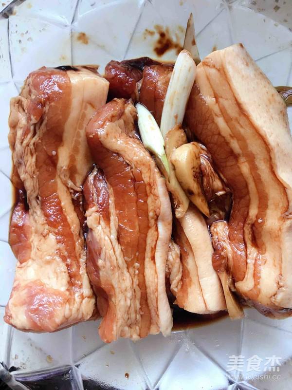 五花肉放入容器中,將生抽醬油和老抽醬油及黃酒面醬還有蔥姜倒入肉中。