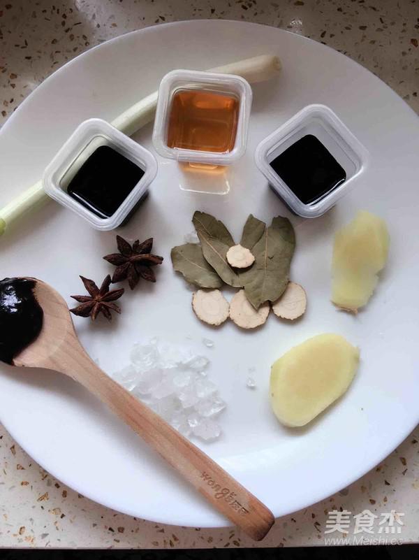 準備香蔥,生抽醬油,老抽醬油、黃酒,面醬,大料、香葉、白芷,姜片和冰糖。