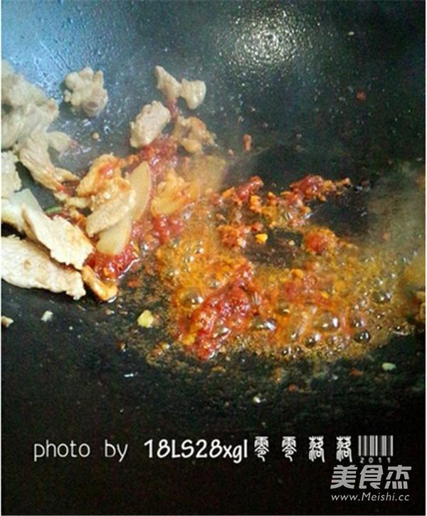 肉片扒拉到一邊,用鍋里余油,爆香蔥末、姜末、蒜末、豆瓣醬后,將肉片和豆瓣醬翻炒均勻