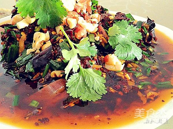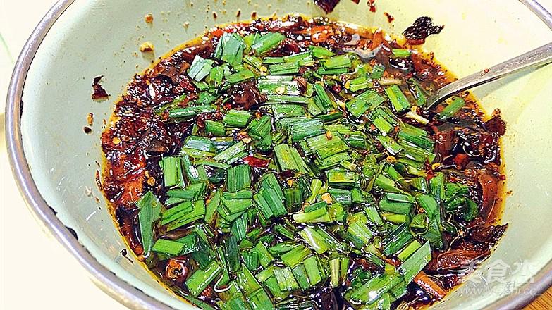 干海椒、干花椒炒香剁成糊辣椒,大蒜、老姜剁粒,韭菜切小段,將姜蒜粒、生抽、蠔油、芝麻油糊辣椒放入碗中淋入八九成的菜油,加味精和韭菜段制成醬汁。