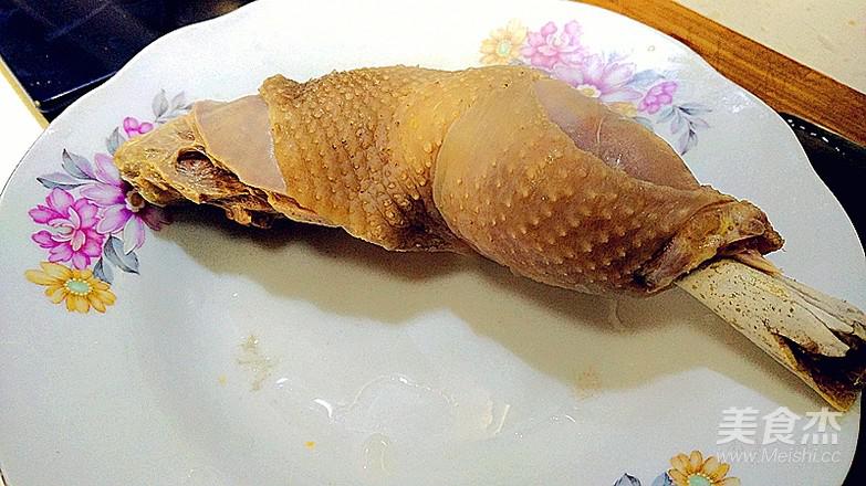 湯鍋中加姜片、料酒,燒沸后放入雞腿,水再沸后關(guān)火,加蓋燜五分鐘;
