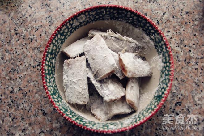 一個雞蛋加三勺淀粉攪拌成糊狀,倒到腌制帶魚的碗里,讓每塊帶魚都沾上雞蛋淀粉。