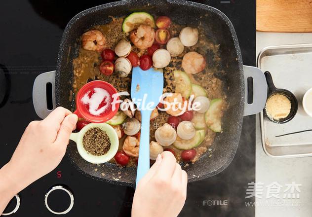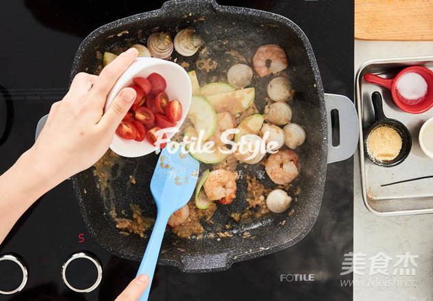 再放入蝦仁和西葫蘆片和櫻桃番茄,加入鹽和黑胡椒粉調味