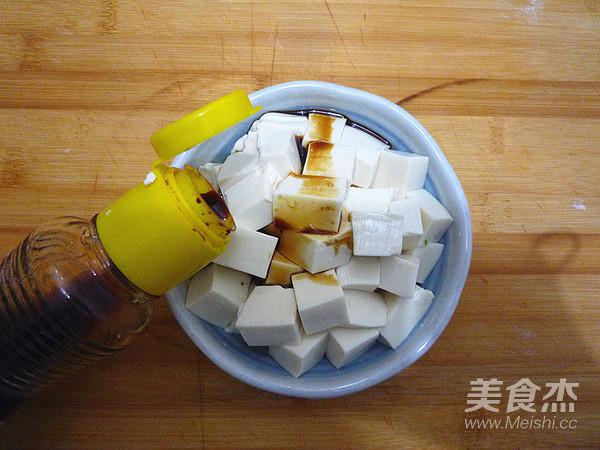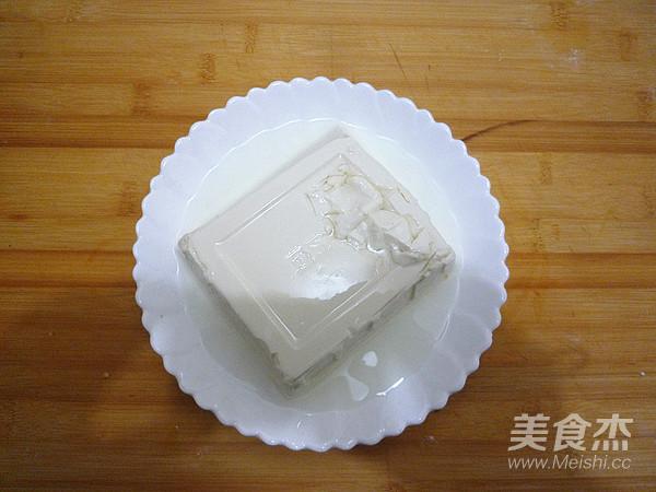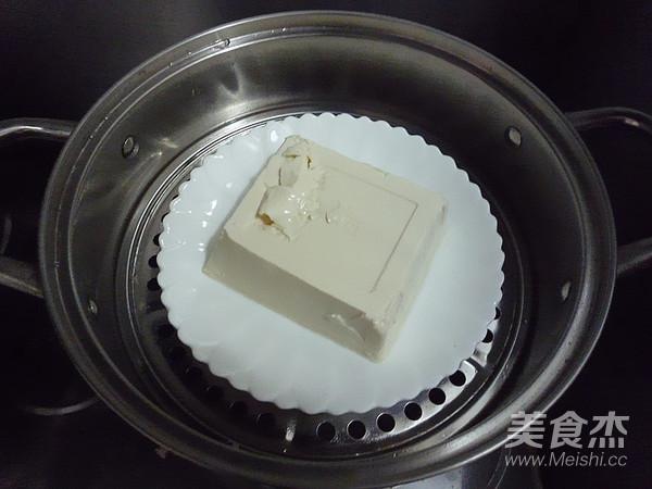 蒸好的豆腐取出,倒去蒸出來的湯汁。