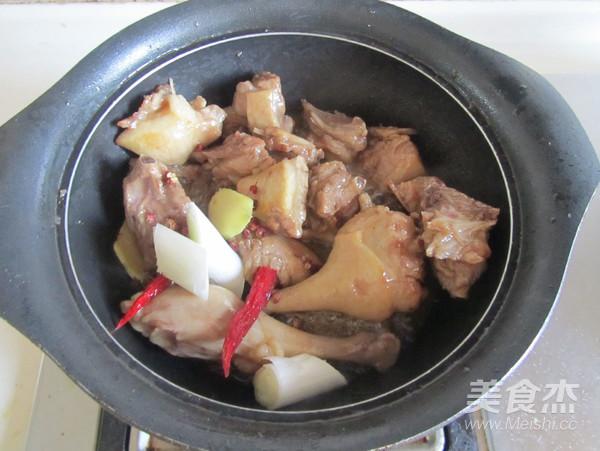 翻炒至鴨子表面微微有些焦黃后加入蔥姜蒜和紅椒繼續翻炒;