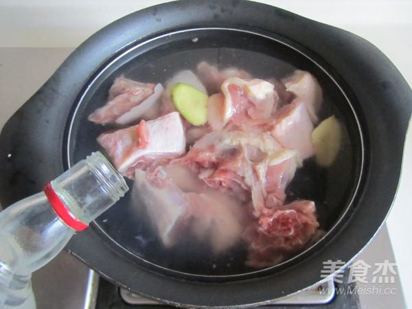 鴨腿塊冷水下鍋, 加入2片姜和適量的高度白酒, 焯水幫助去腥;
