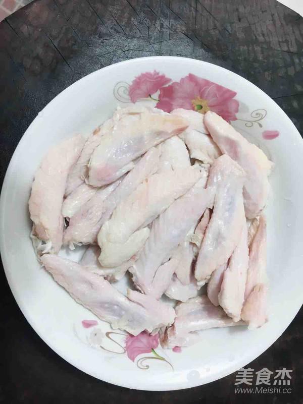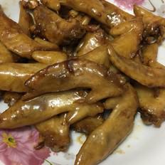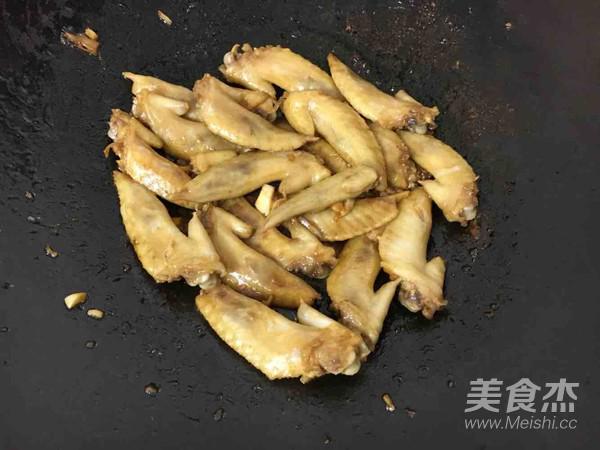 鍋熱放油把雞翼尖翻炒幾下變顏色了就放蒜頭和姜,然后放點鹽,倒入少量水,放點醬油悶熟透