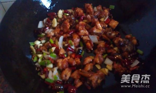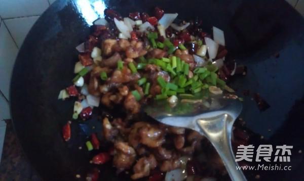 8.炒香后,這時(shí)才把事先炸過的雞丁和小蔥放入鍋內(nèi)翻炒