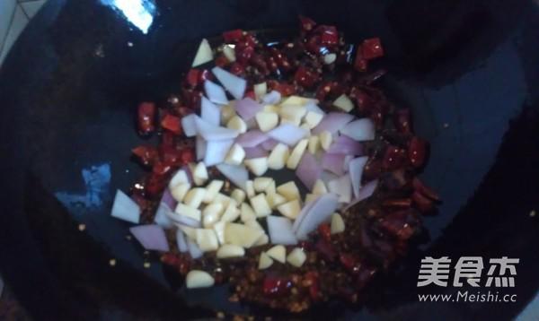 7.煸到可以聞到很香的花椒與辣椒香時(shí),把蔥、姜、蒜和洋蔥片放入鍋內(nèi)翻炒