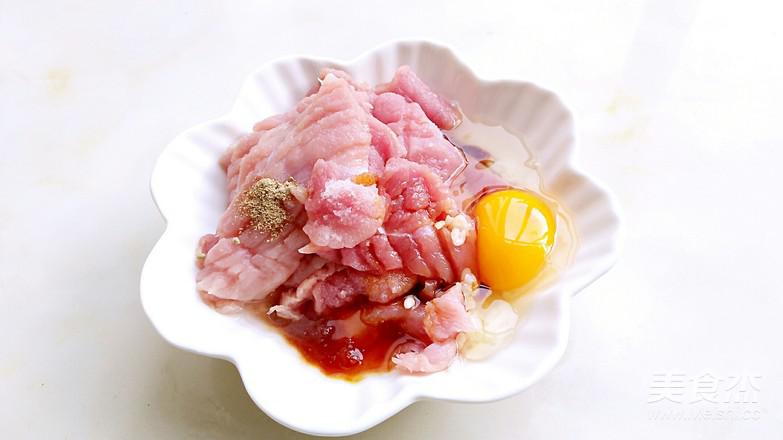 3.大碗中:里脊肉,雞蛋,胡椒粉,生抽1茶匙,砂糖1克,米酒2茶匙,鹽1克。