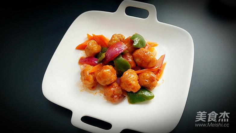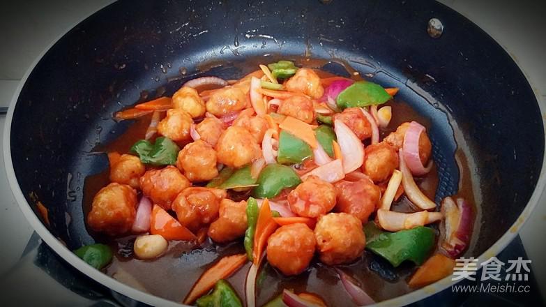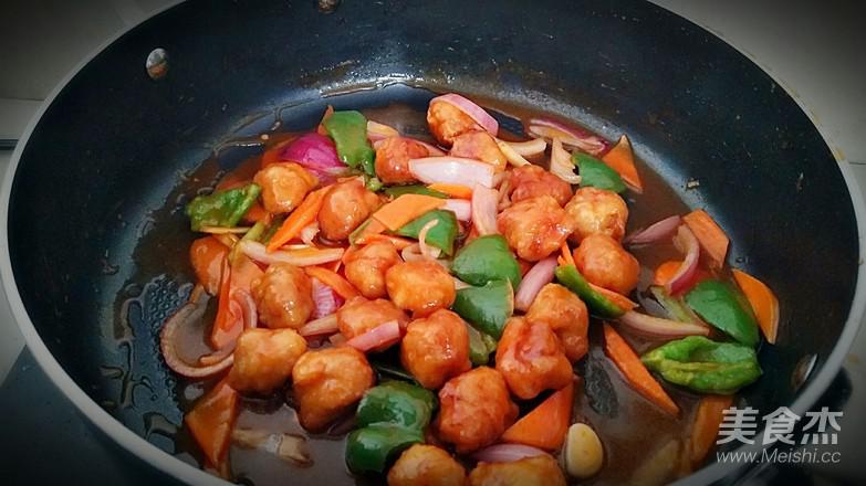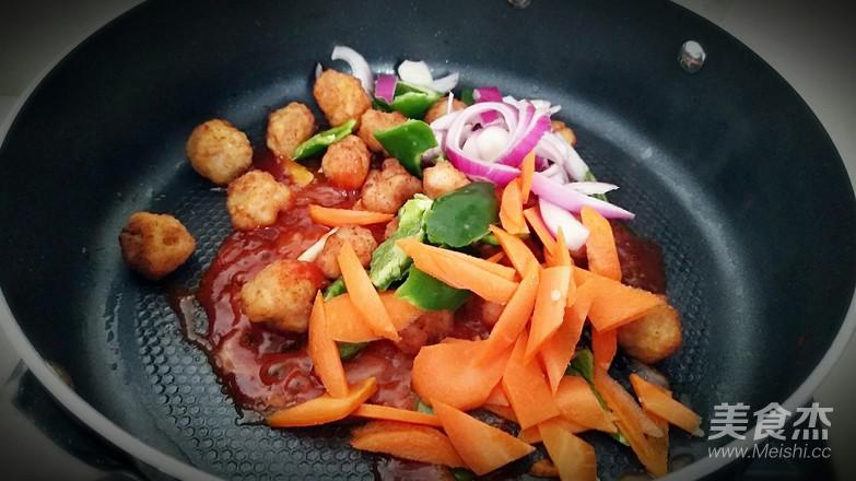13.倒入里脊肉球和蔬菜中火翻炒。