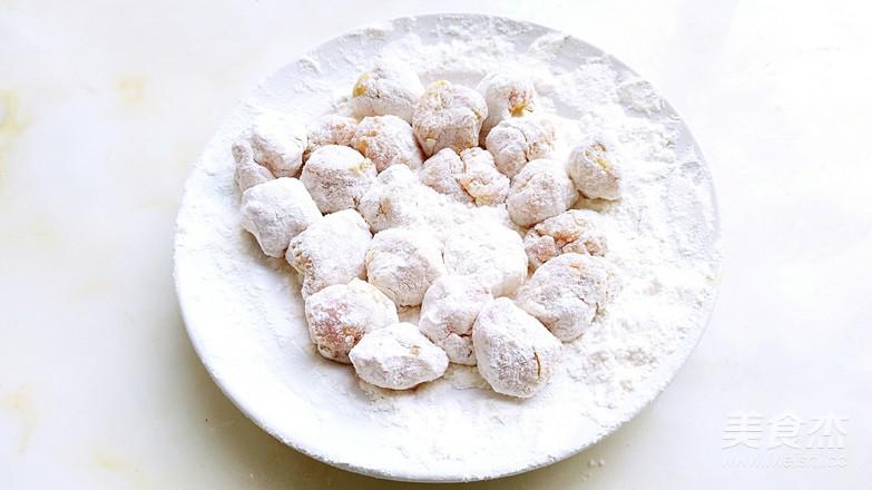 5.用面粉均勻的捏成球狀,雙手裹上面粉就會放黏,靜止片刻,讓面粉吸附一下。