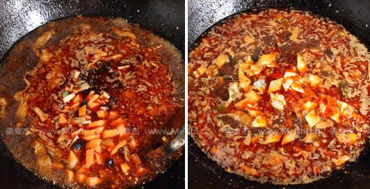 5.煸炒約半分鐘出紅油,接著下五香粉和花椒面炒十秒出香氣,開大火,下醬油和黃酒爆香,接著下醋燒開