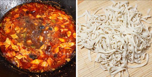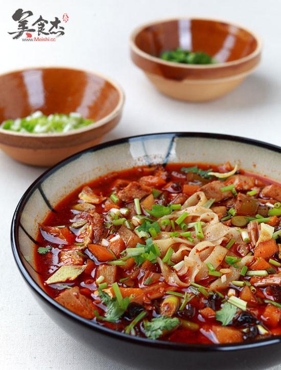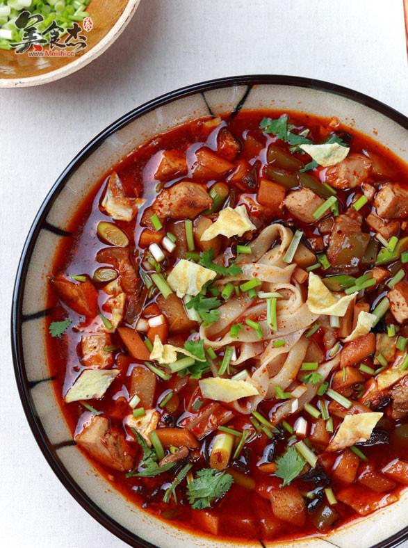 8.做面條:把堿和少許鹽放碗中,用涼水調(diào)勻后和面至光滑,然后用濕布蓋上餳三個小時左右最好,這樣出來的面比較有韌性,手工搟成面條或機器壓面條,放入開水中煮熟,撈出瀝干水分,加上臊子鹵拌均即可
