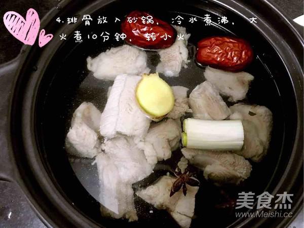 排骨放入砂鍋中,冷水煮沸,大火煮10分鐘,轉小火