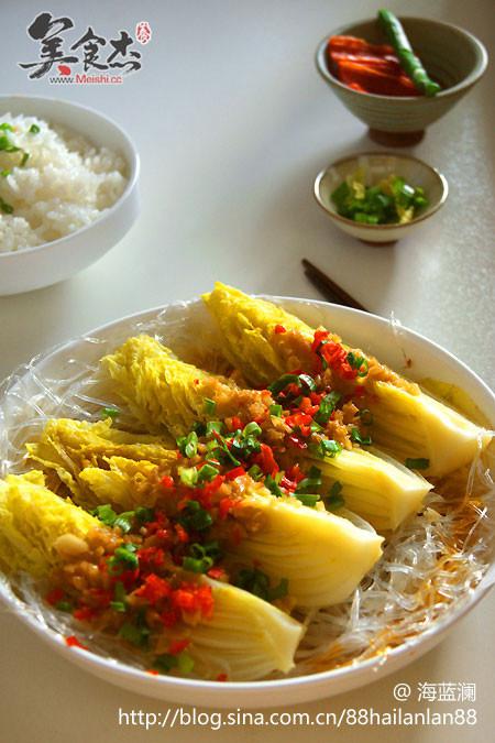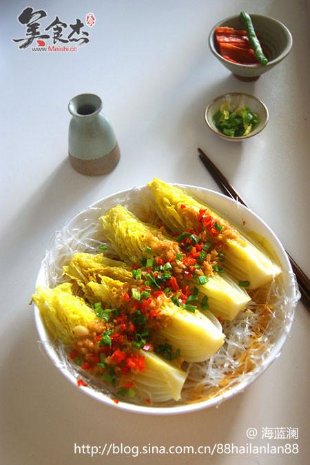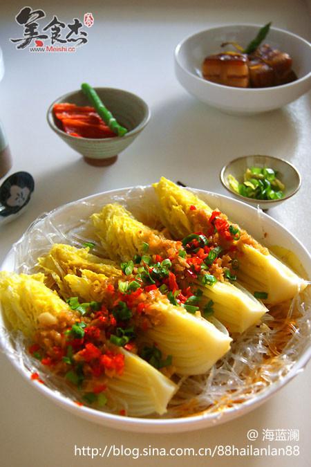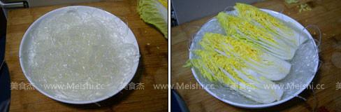 4.泡軟的粉絲鋪在盤底,擺放娃娃菜