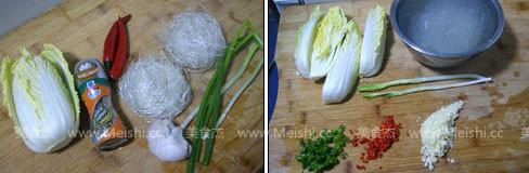 1.準備好上述所需食材,將娃娃菜切成4瓣,粉絲泡軟、大蒜切末、香蔥切粒、紅尖椒切碎