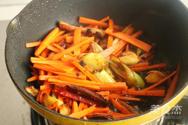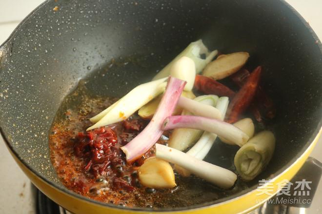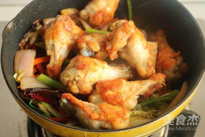 雞翅根移出待用,利用煎出的油,炒香郫縣豆瓣醬和香料等。