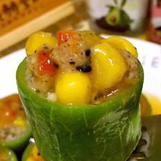 食材:絲瓜、豬肉泥、玉米粒、甜椒定、玉米淀粉、寶寶醬油、海蝦黑芝麻粉、黑芝麻牛油果油