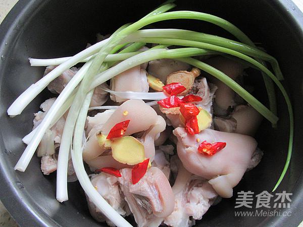 6.煮鍋里加入適量的水,放入豬蹄、蔥段、生姜、辣椒(辣椒不要太多),轉(zhuǎn)文火繼續(xù)煲煮30分鐘,煮好后為了好看些撈去蔥段