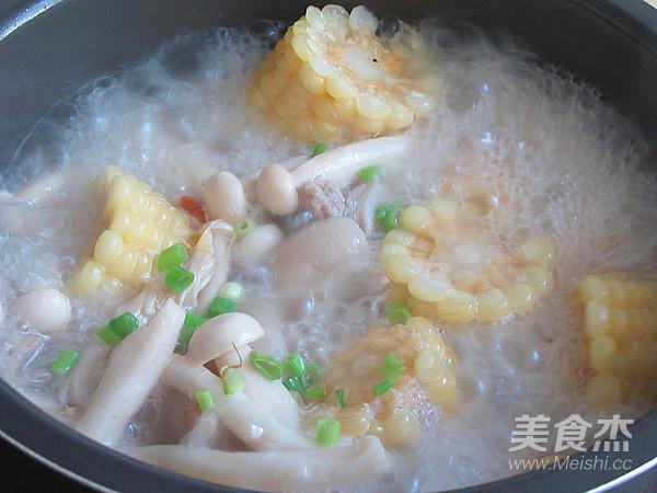 7.加入玉米段、海鮮菇、香菇片、鹽、枸杞,轉(zhuǎn)文火繼續(xù)煲煮;煮至豬腳和玉米都能插進(jìn)筷子為止、湯膠質(zhì)濃稠呈乳白色最佳,撒入蔥花,關(guān)火出鍋
