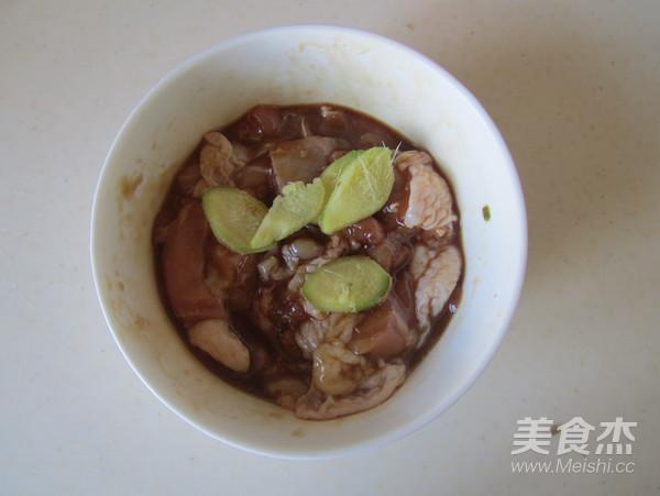 雞腿肉切成小塊后加入鹽、淀粉,加入生抽、料酒和蠔油等拌均勻后腌制一下;