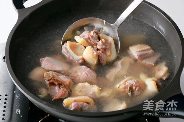 湯鍋中加入清水和少許花雕酒,放入鴨子,煮沸后撇去浮末撈出鴨子控干。