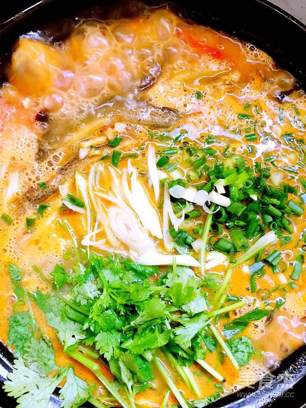 泥鰍熟透后(嘗鹽味是否需要再添加)加入大蔥絲、小蔥花、香菜。放少量芝麻油和雞精,關火開吃。