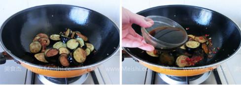 4.鍋中留底油,下蔥、蒜、姜末炒香,再放入泡辣椒碎炒出香味后,放入茄子